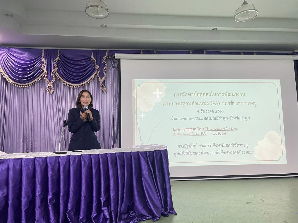 วันที่ 4 ธันวาคม 2565 วิทยาลัยเกษตรและเทคโนโลยีลำพูน จัดโครงการอบรมเพื่อพัฒนาบุคลากร เพื่อสร้างความเข้าใจ หลักเกณฑ์ และวิธีการประเมินตำแหน่งและวิทยฐานะ (วPA) สู่การปฏิบัติจริง ของข้าราชการครู โดยได้รับเกียรติจาก ดร. ณัฐนันท์ ชุมแก้ว ศึกษานิเทศก์เชี่ยวชาญ ผู้อำนวยการศูนย์ส่งเสริมและพัฒนาอาชีวศึกษาภาคใต้ เขตพัฒนาพิเศษเฉพาะกิจจังหวัดชายแดนภาคใต้ (จชต.) ร่วมกับ ดร. สุรัตน์นารี ธิลาใจ ศึกษานิเทศก์ ศูนย์ส่งเสริมและพัฒนาอาชีวศึกษาภาคเหนือ มาเป็นวิทยากรในการบรรยาย ณ หอประชุมสุริยะ วิทยาลัยเกษตรและเทคโนโลยีลำพูน