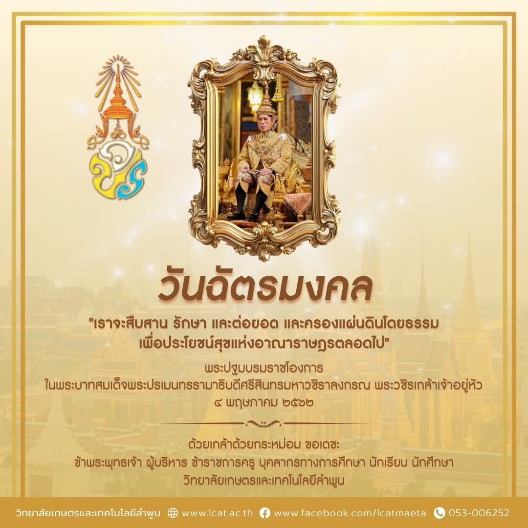 ๔ พฤษภาคมวันฉัตรมงคล.วันที่รำลึกถึงพระราชพิธีบรมราชาภิเษก เป็นพระมหากษัตริย์ รัชกาลที่ ๑๐ แห่งราชวงศ์จักรี ของพระบาทสมเด็จพระปรเมนทรรามาธิบดีศรีสินทรมหาวชิราลงกรณ พระวชิรเกล้าเจ้าอยู่หัว โดยพระราชพิธีบรมราชาภิเษกมีขึ้นเมื่อวันที่ ๔ พฤษภาคม พ.ศ. ๒๕๖๒.ขอพระองค์ทรงพระเจริญ.ด้วยเกล้าด้วยกระหม่อม ขอเดชะข้าพระพุทธเจ้า ผู้บริหาร ข้าราชการครู บุคลากรทางการศึกษา นักเรียน นักศึกษาวิทยาลัยเกษตรและเทคโนโลยีลำพูน#วันฉัตรมงคล#งานประชาสัมพันธ์วิทยาลัยเกษตรและเทคโนโลยีลำพูน