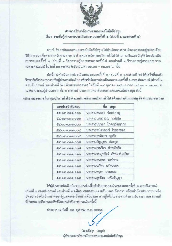 ประกาศ รายชื่อผู้ผ่านการประเมินสมรรถนะ ครั้งที่ 1(ส่วนที่ 1 และส่วนที่ 2) เพื่อเข้าประเมินสมรรถนะ ครั้งที่ 2 คัดเลือกเป็นพนักงานราชการ ตำแหน่งพนักงานบริหารทั่วไป(ด้านการเงินและบัญชี)