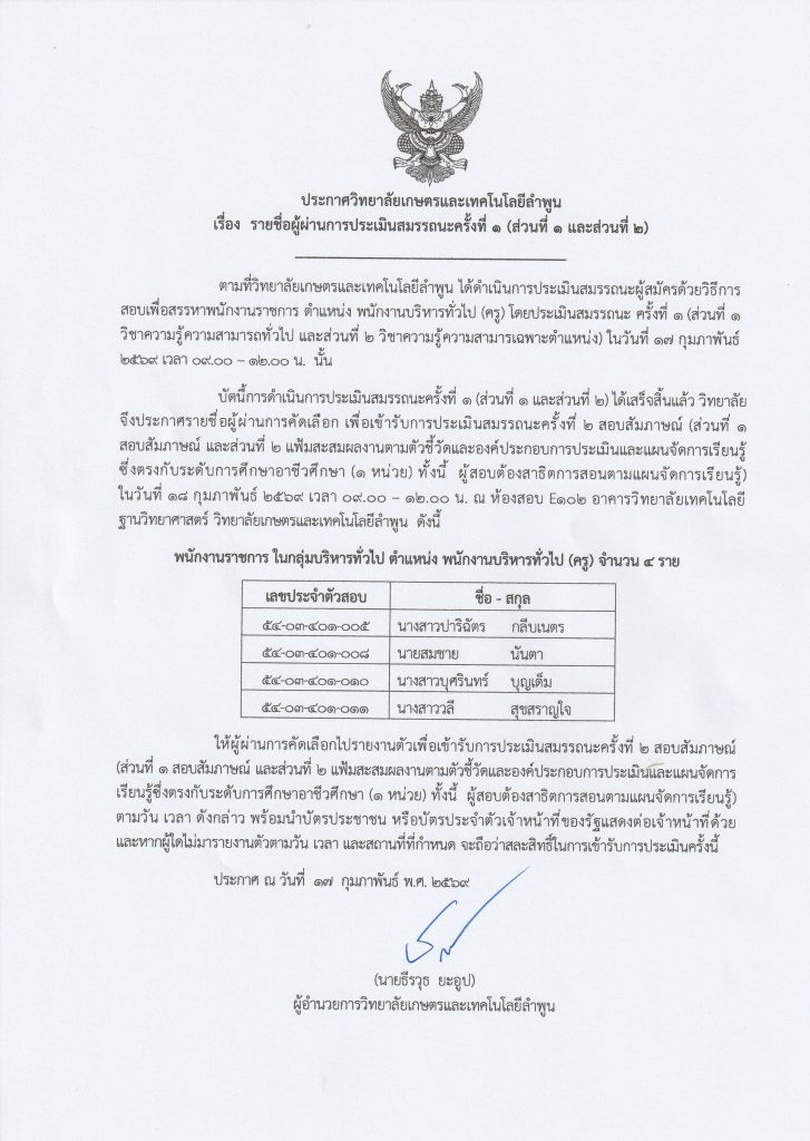 ประกาศ รายชื่อผู้ผ่านการประเมินสมรรถนะ ครั้งที่ 1(ส่วนที่ 1 และส่วนที่ 2) เพื่อเข้าประเมินสมรรถนะ ครั้งที่ 2 คัดเลือกเป็นพนักงานราชการ ตำแหน่งพนักงานบริหารทั่วไป (ครู)