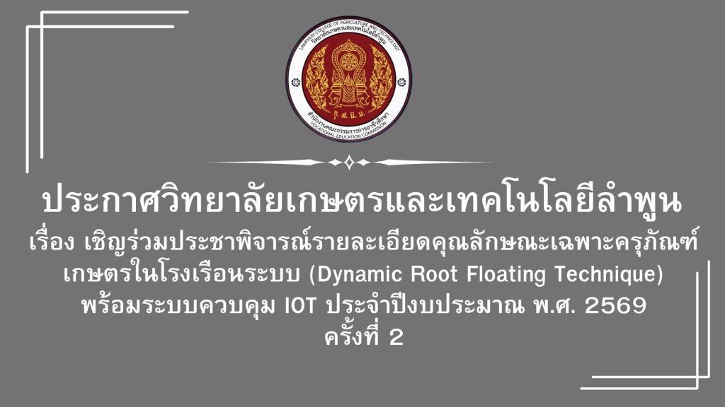 ประกาศ เรื่อง เชิญร่วมประชาพิจารณ์รายละเอียดคุณลักษณะเฉพาะครุภัณฑ์เกษตรในโรงเรือนระบบ (Dynamic Root Floating Technique) พร้อมระบบควบคุม IOT ครั้งที่ 2