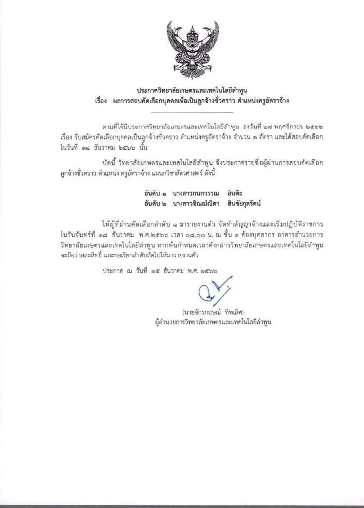 ประกาศวิทยาลัยเกษตรและเทคโนโลยีลำพูน เรื่องผลการสอบคัดเลือกบุคคลเพื่อเป็นลูกจ้างชั่วคราว ตำแหน่งครูอัตราจ้าง แผนกวิชาสัตวศาสตร์