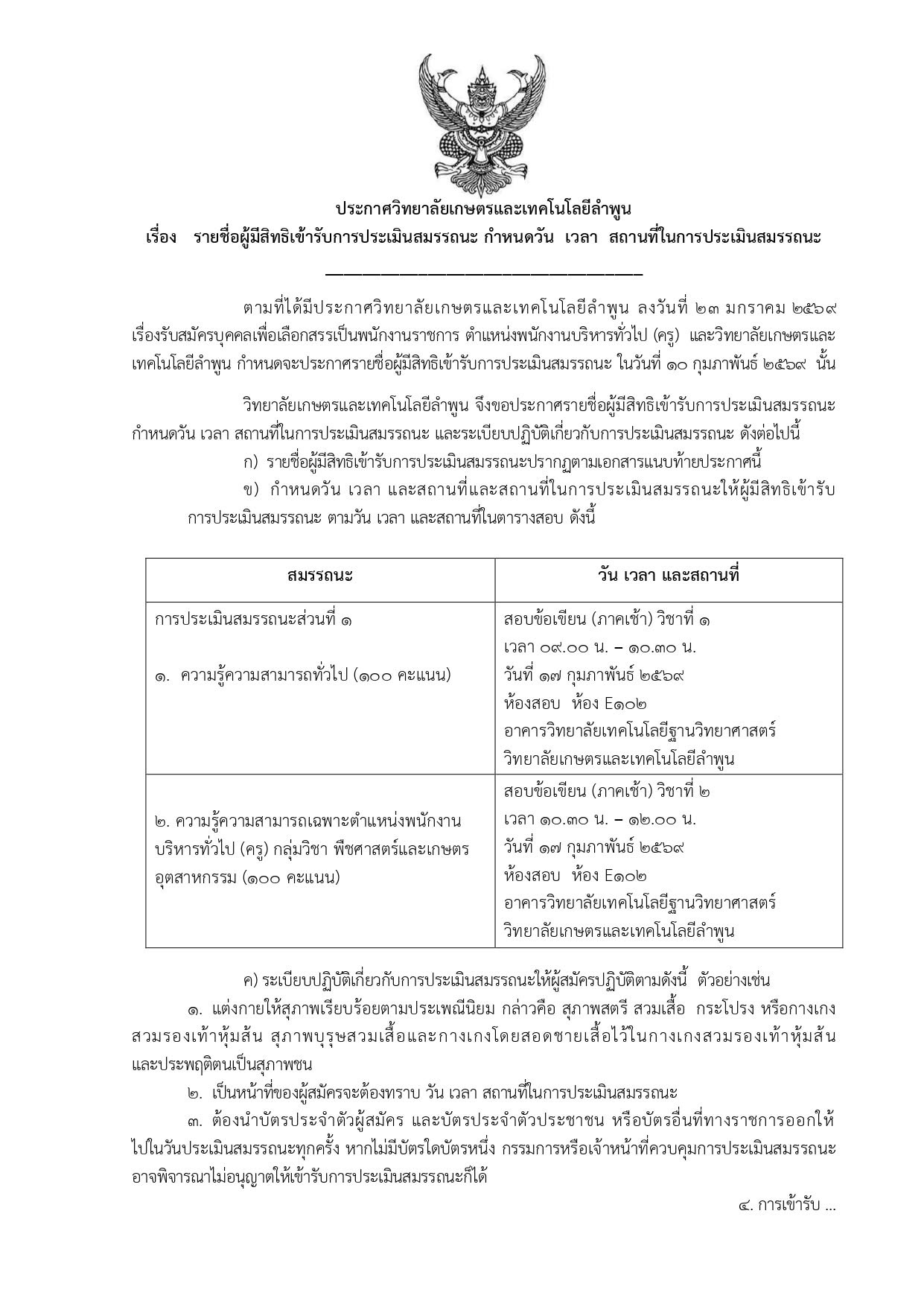 ประกาศวิทยาลัยเกษตรและเทคโนลำพูน เรื่อง รายชื่อผู้มีสิทธิการประเมินสมรรถนะ กำหนดวัน เวลาสถานที่ในการประเมินสมรรถนะพนักงานราชการ ตำแหน่งพนักงานบริหารทั่วไป (ครู)
