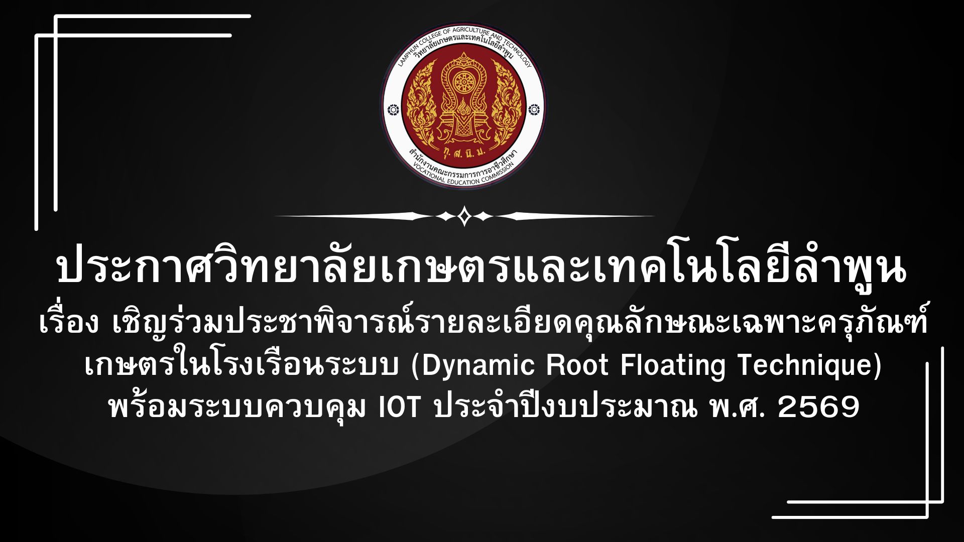 ประกาศ เรื่อง การประกวดจัดซื้อครุภัณฑ์เกษตรในโรงเรือน (Dynamic Root Floating Technique)พร้อมระบบควบคุม IoT